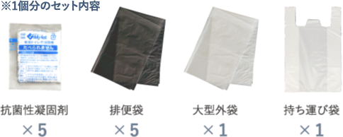 緊急災害用に開発した大小兼用の備蓄トイレです。水を使わずに、既存のトイレ等で簡単にトイレ処理ができます。使用している抗菌性凝固剤は皮膚刺激性試験、経口毒性試験、抗菌性試験、長期安定性試験といった各種試験を行い、安全性を確認しています。